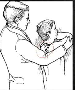 Examinador atras do paciente, com uma mão estabilizando a escapula