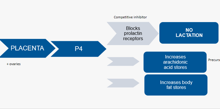 P4 inhibits synthesis of a-lactalbumin => inhibits lactose production