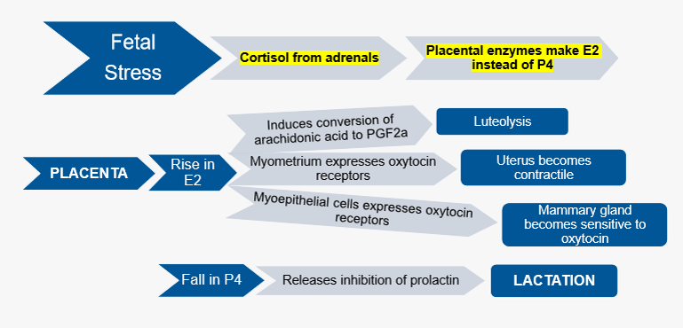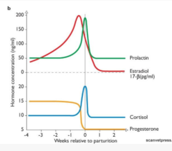 Describe the hormonal switches at parturition leading to lactation
