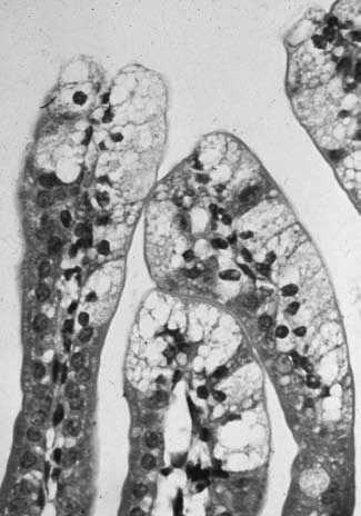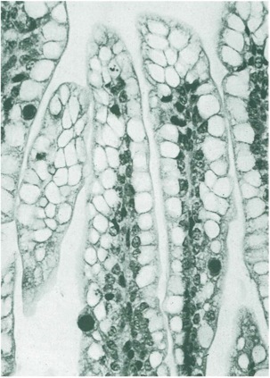 Rotavirus preferentially infects terminally differentiated enterocytes of the small and large intestine. The number of such cells decreases as the intestinal tract matures.