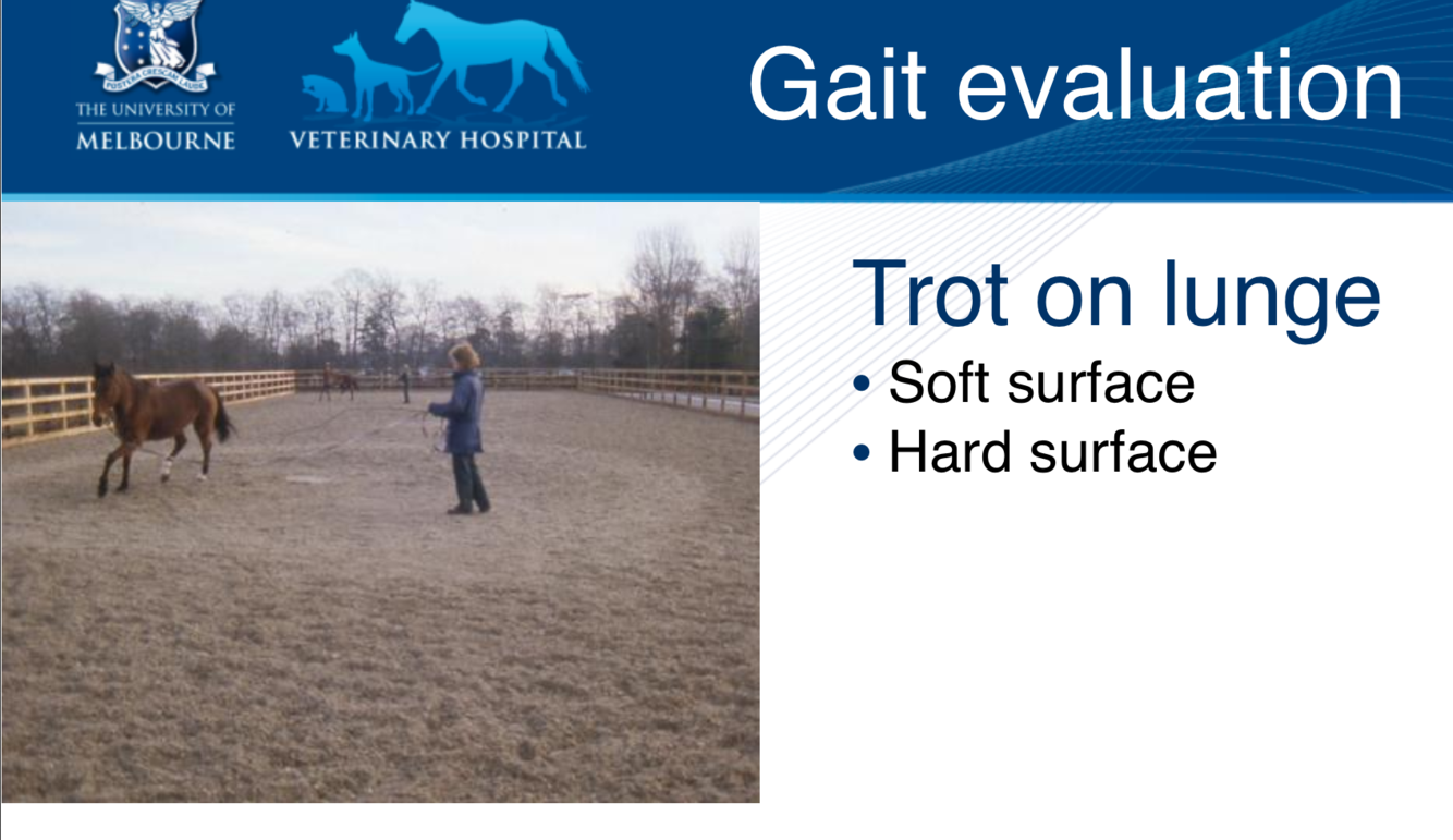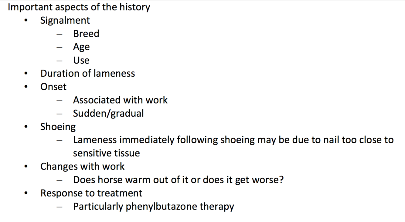 * Signalment, duration, onset (associated with work, sudden/ gradual), shoeing, changes with work, response to treatment