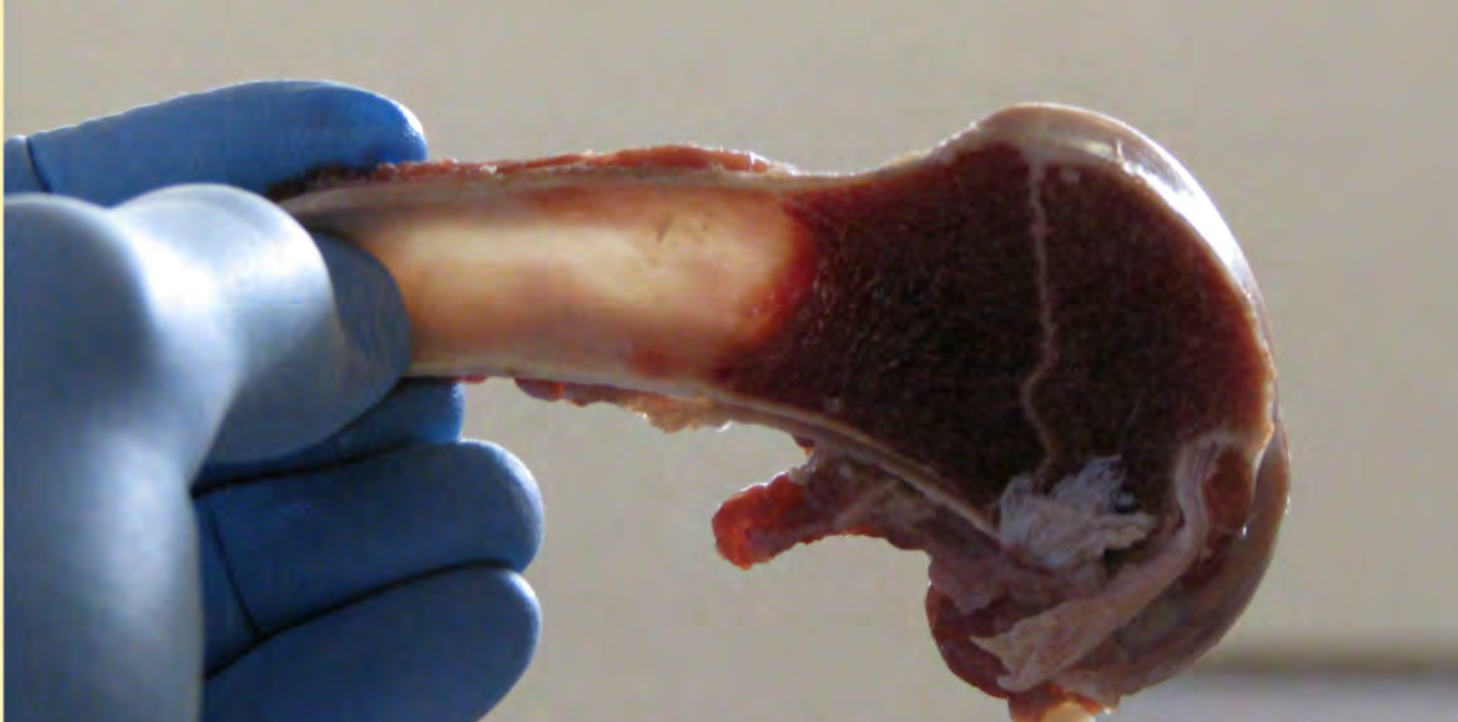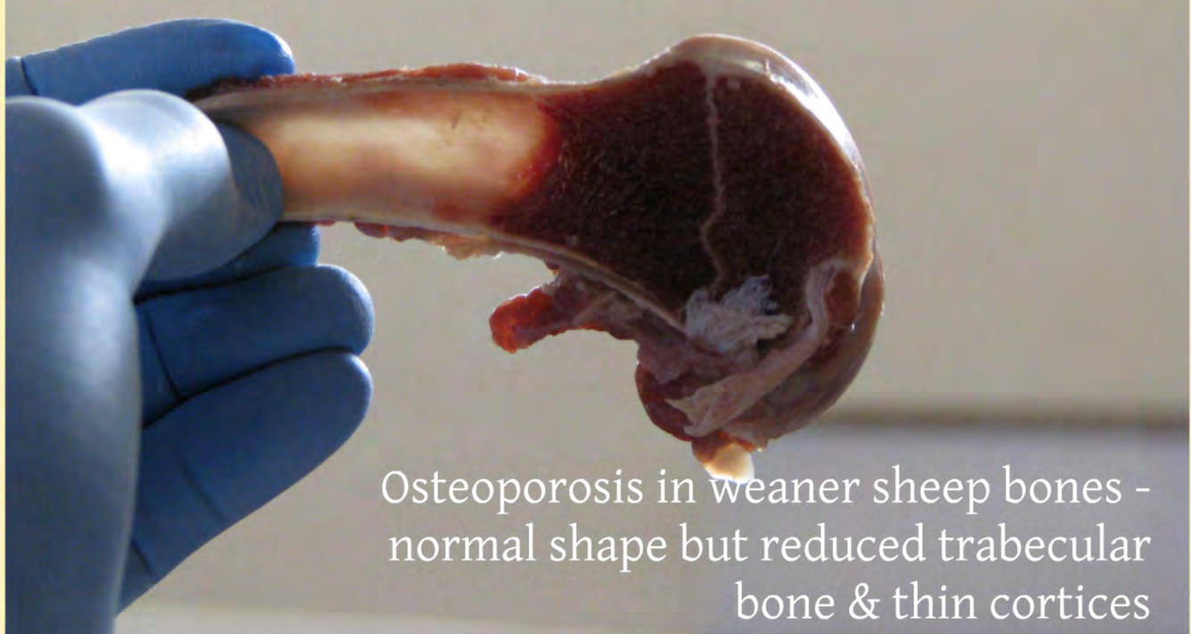 ** the resulting weak bone structure goes unnoticed until lambs are slaughtered where it is detected as calluses primarily in ribs but occasionally affects pelvic and long bones as well