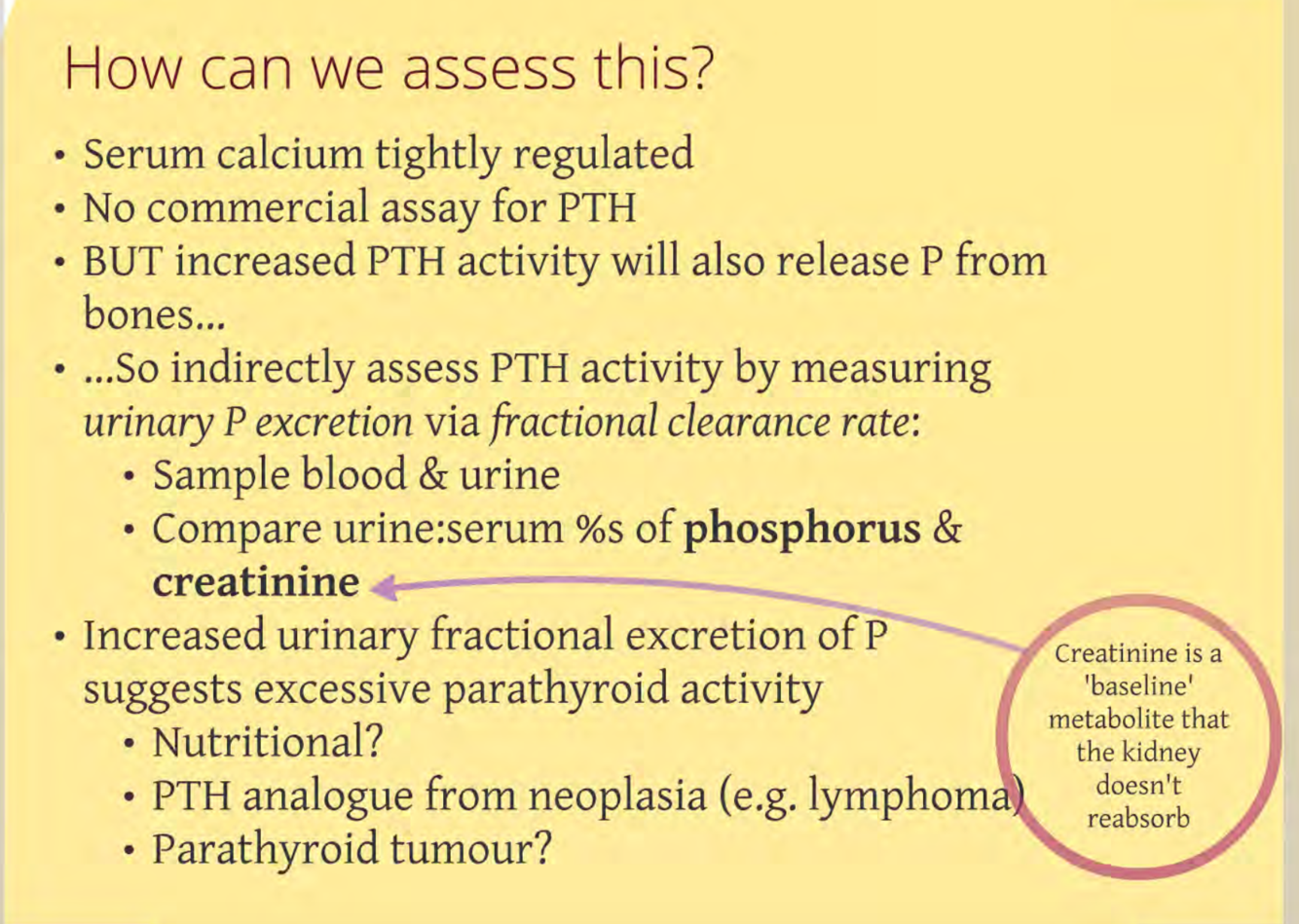 * Urinary P excretion… compare urein: serum % of phosphorous and creatinine (baseline metabolite that the kidney doesn’t reabsorb)
