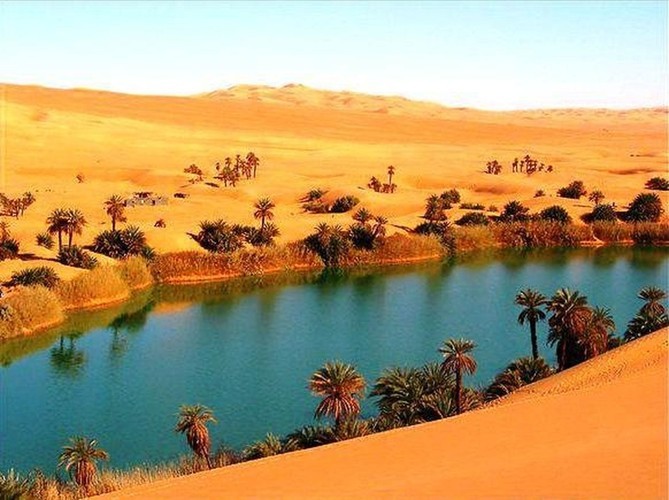 A fertile place in the desert with water and some vegetation