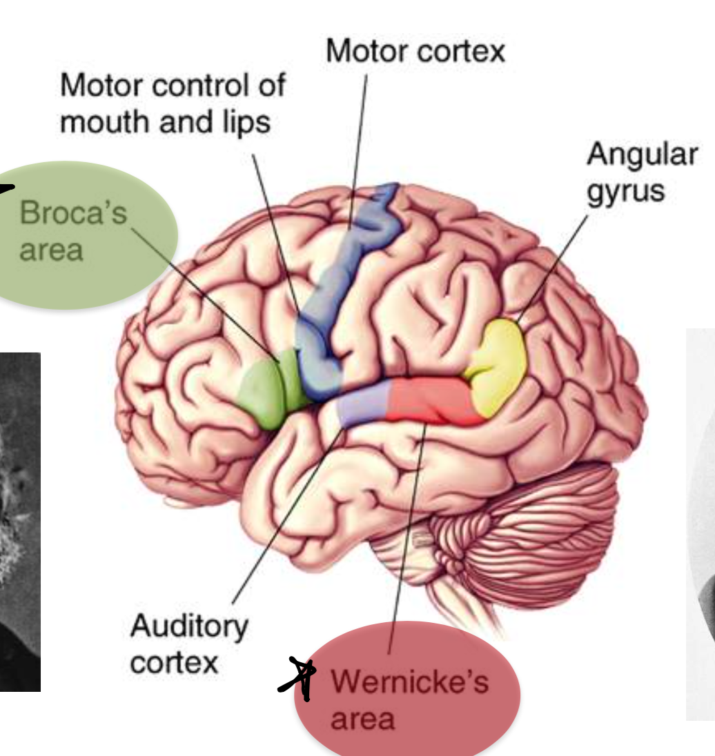 broca’s aphasics cannot match a sentence to a picutre that relies on sentence comprehension, not all broca’s aphasics have lesions in broca’s area, broca’s patients suffered most of thier damage outside of broca’s area, aphasia wasn’t always lasting (could overcome with language therapy), sujects asked to read and repeat words showed that broca’s is active before but not during word proudction -> Broca’s coordinates transmission of info bt cortical areas involved in language processing rather than being directly implicated in speech production. broca’s is active during stroop task -> resolves representational and interpretational conflict. Broca’s works as a cognitive control area: willpower, impulse control, the ability to focus on what you are currently trying to achieve even when there are distractions, the ability to supress noice and focus on what’s important, the ability to inhibit signal A in order to pay attention/ execute on signal B