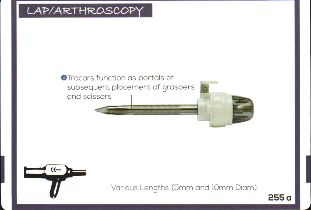 Trocar and Cannula: trocars are pen-shaped and usually lodged in a hollow tube called the cannula: they can be used to great the incisions in the abdomen to allow access for the cameras or robotic arms as well as expel gas
