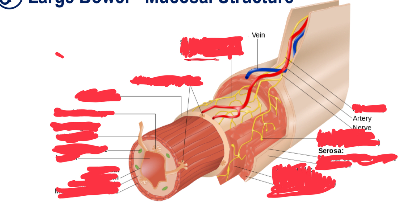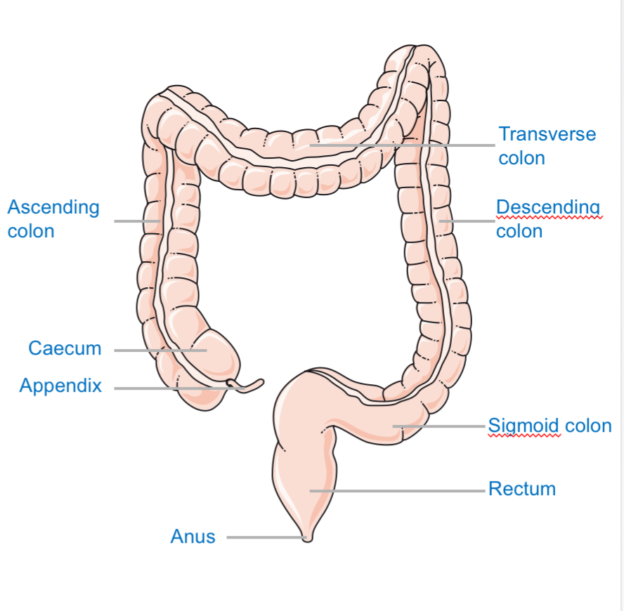 Caecum- blind pouch just distal to ileocecal valve; the caecum is larger in herbivores