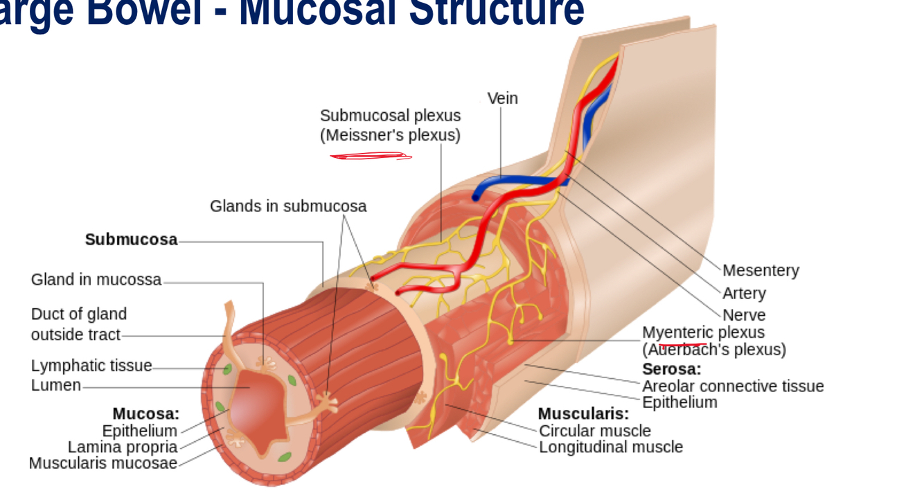 Descirbe the distribution and features of the goblet cells in the large bowel