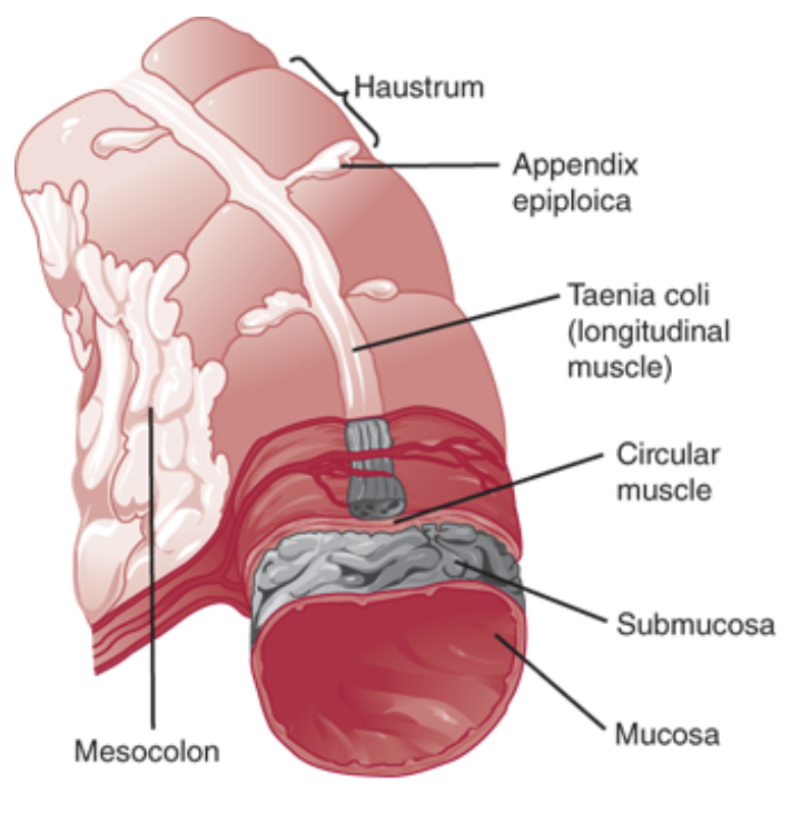 Like the small bowel, muscularis externa consists of an inner circular and outer longitudinal layer.