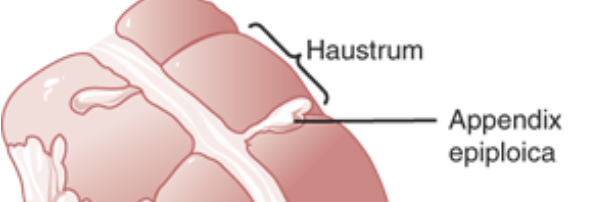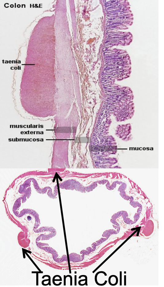 Bundles of muscle from the teniae coli penetrate the circular layer at irregular intervals.