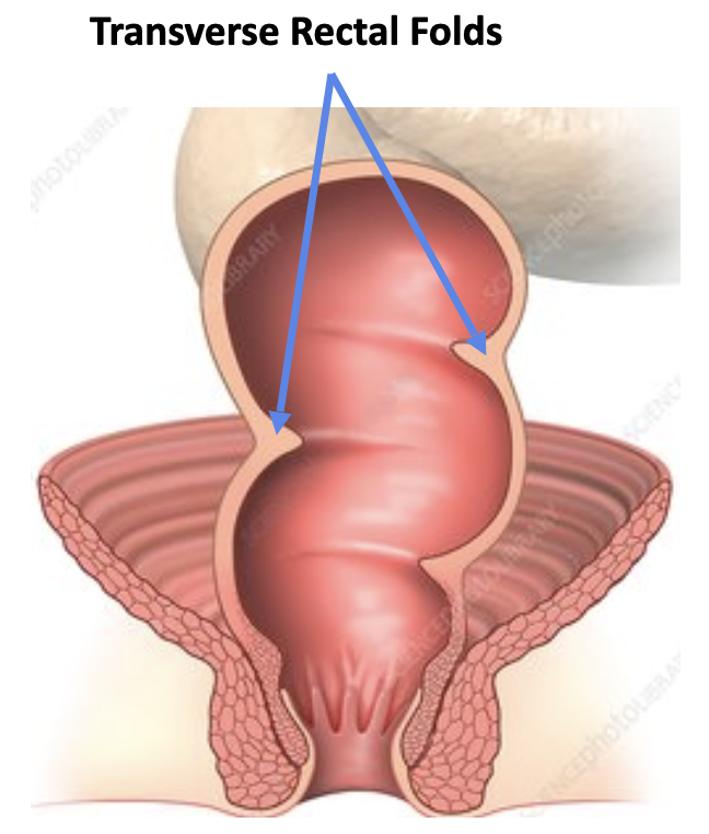 Rectal folds in its submucosa and the absence of taenia coli in its muscularis externa