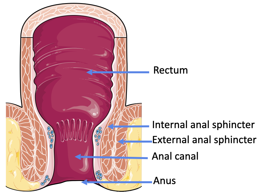 Surrounded by internal (circular muscle) and external (striated muscle) anal sphincters.