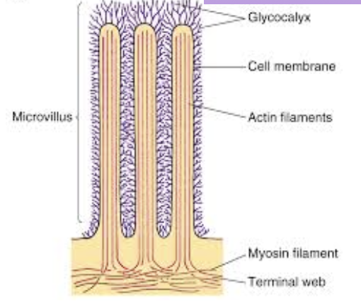 Enterocytes have short, irregular microvilli - primarily concerned with resorption of salts.