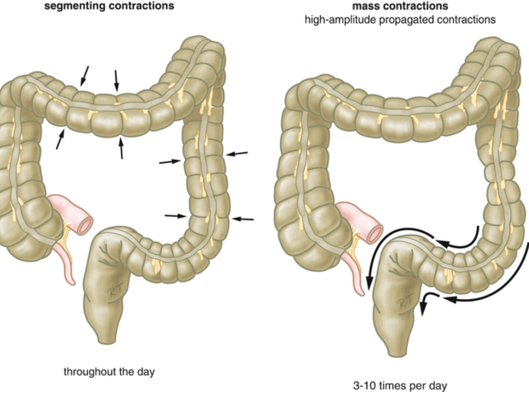 1-3 times daily- mass movement- resembles peristaltic wave.
