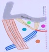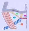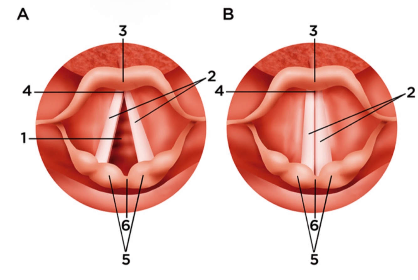 (1) glote: (2) pregas vocais; (3) epiglote; (4) comissura anterior, (5) aritenoides; (6) comissura pontono