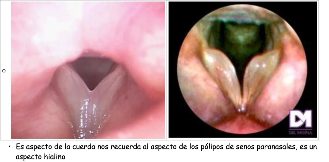 Inflamación del espacio de Reinke, aspecto hialino, bilateral, asociado a mujeres > 40 años, tabaquismo, alcohol, obesidad y abuso vocal.