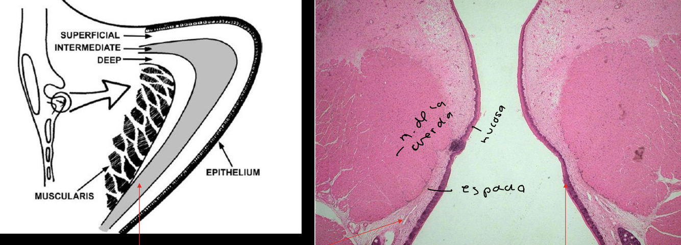Colchón de gel de matriz como sábila, debajo del epitelio para compensar la vibración de doble eje de la cuerda vocal, cuando se pierde ocasiona la presbifonía (viejitos)