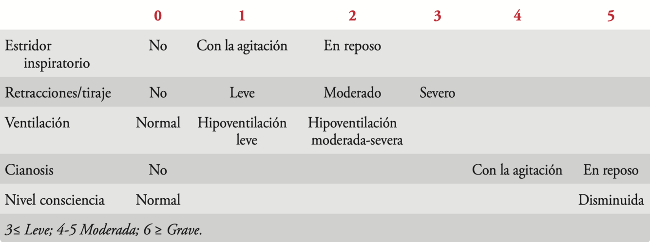 Crisis moderada (Westley 4-5): se puede intentar administrar inicialmente una dosis de corticoide (oral o nebulizado) y mantener en observación. Si presenta mejoría se podría plantear el alta. Si no mejora, se indica administrar adrenalina nebulizada.