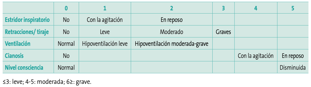 Crisis leve (Westley ≤ 3): se puede iniciar una pauta de corticoterapia oral (o nebulización de budesonida si presenta intolerancia oral) y dar alta con signos de alarma.