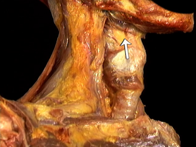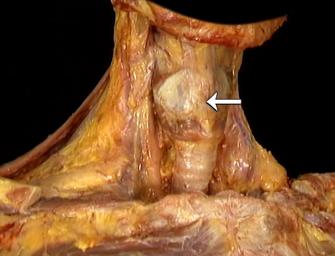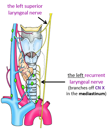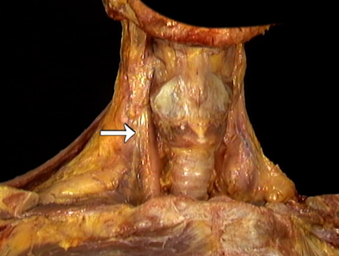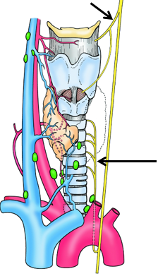 Anterior to the laryngopharynx Between the carotid sheath structures