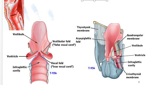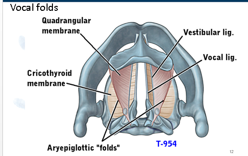 Arytenoid cartilages to epiglottis: Quadrangular ligament - free edge is vestibular ligament