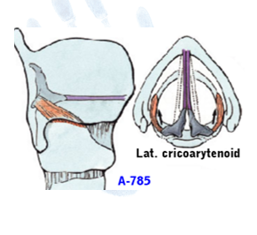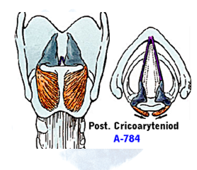 Pulls muscular process of arytenoid backwards - rotating vocal process laterally which gives an abduction of the vocal fold