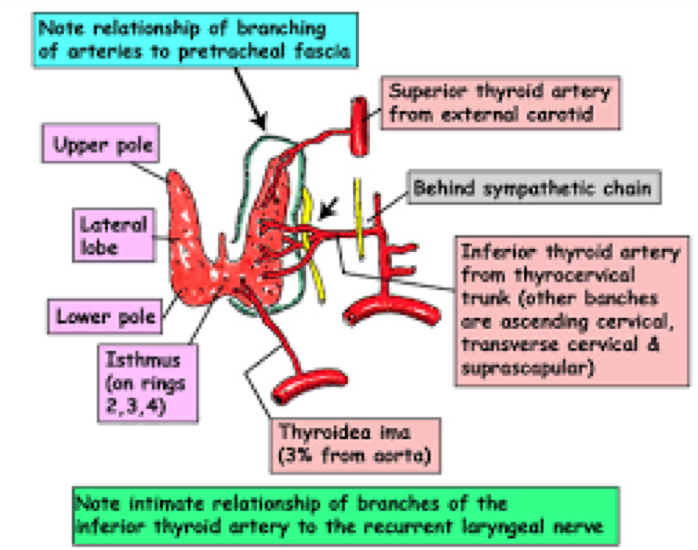 Describe the anatomy of the thyroid gland, its anatomical relations in the neck and the relationship between its blood supply and the nerves supplying the larynx and vocal cords?