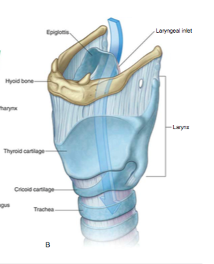 The hyoid bone most superior, thyroid cartilage immediately inferior to this (largest of the three cartialges) and cricoid cartilage inferiorly to this (shaped like a signet ring which broad arch posterior and narrower arch of tissue anteriorly). The epiglottis is a leaf shaped cartilage- attaches to the anterior wall of the thyroid cartilage and projects posterosuperiorly.