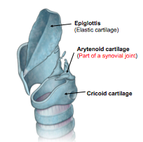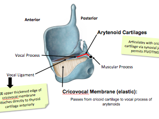 The arytenoid cartilages articulate with the cricoid cartilage inferiorly and a synovial joint exists here which allows rotational movement- PIVOTING. This alters the shape of our vocal cords and therefore allows us to alter pitch.