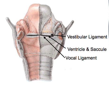 A mucosal pouch exists inbetween the vestibular and vocal ligaments and is formed of two parts 1) the ventricle 2) the saccule