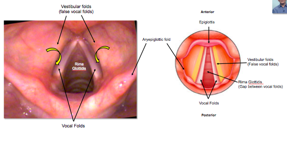 Inbetween the vocal folds and vestibular folds are the ventricule and saccule.