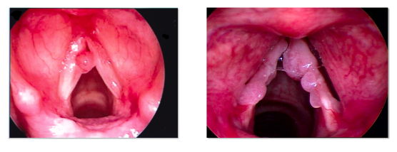 Vocal cord nodules on the vocal folds - patient would have difficulty with phonation and protection of airways