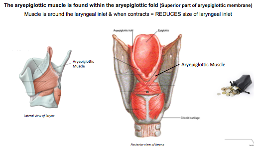 When this muscle contracts it closes the top of the larynx- reducing the size of the laryngeal inlet.