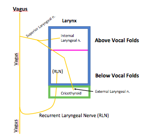 The recurrent laryngea nerve is a branch that moves back in the thorax, enters the larynx to innervate all the other muscles of the larynx (except cricothryoid muscle) and provides sensory innervation below the vocal folds.