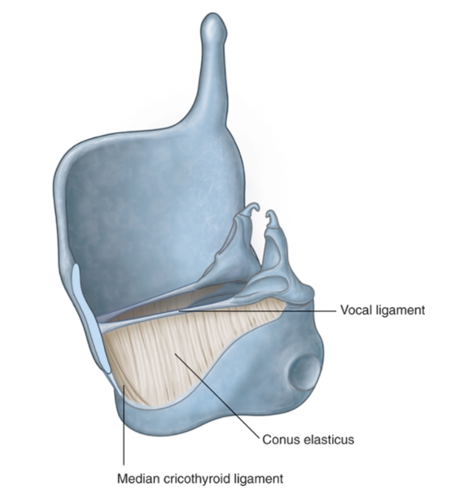 When the airway is blocked above the level of the vocal folds, the median cricothyroid ligament can be perforated to establish an airway