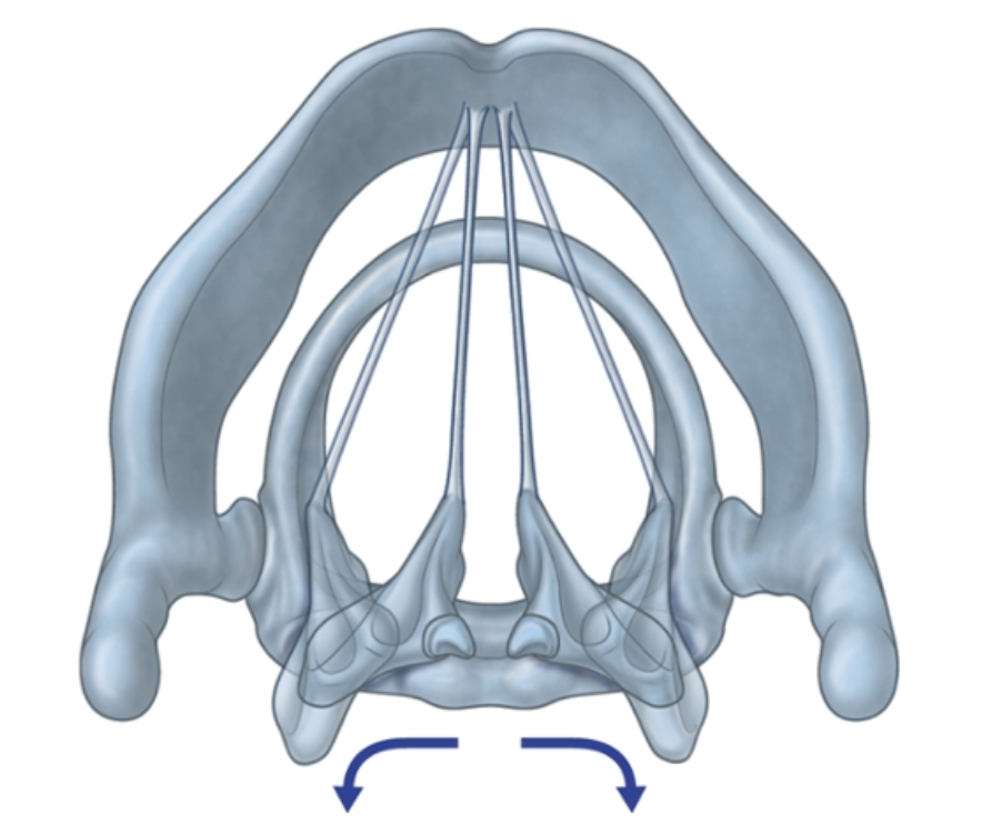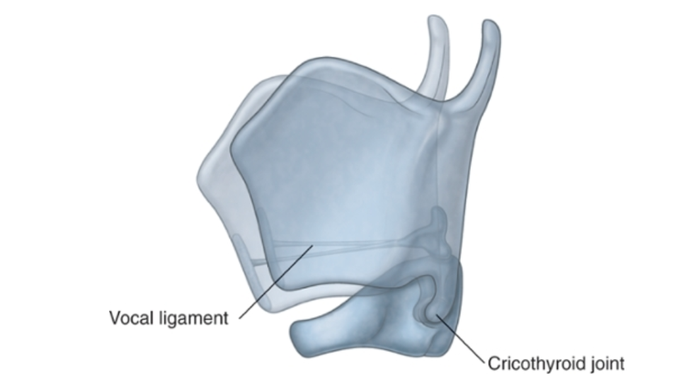 Because the vocal ligaments pass between the posterior aspect of the thyroid angle and the arytenoid cartilages that sit on the lamina of cricoid cartilage, forward movement and downward rotation of the thyroid cartilage on the cricoid cartilage effectively lengthens and puts tension on the vocal ligaments