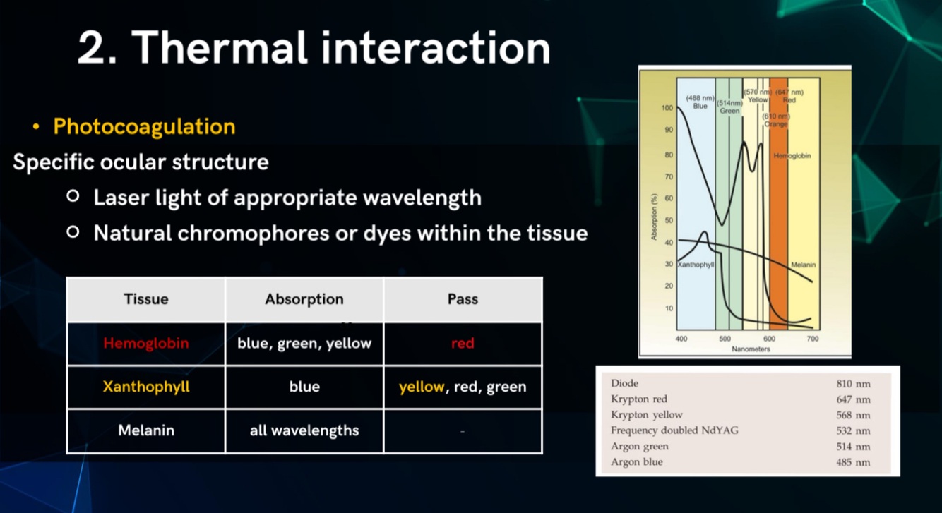 Selective absorption → different eye tissues absorb different wavelengths (e.g., hemoglobin absorbs green argon better than IR).