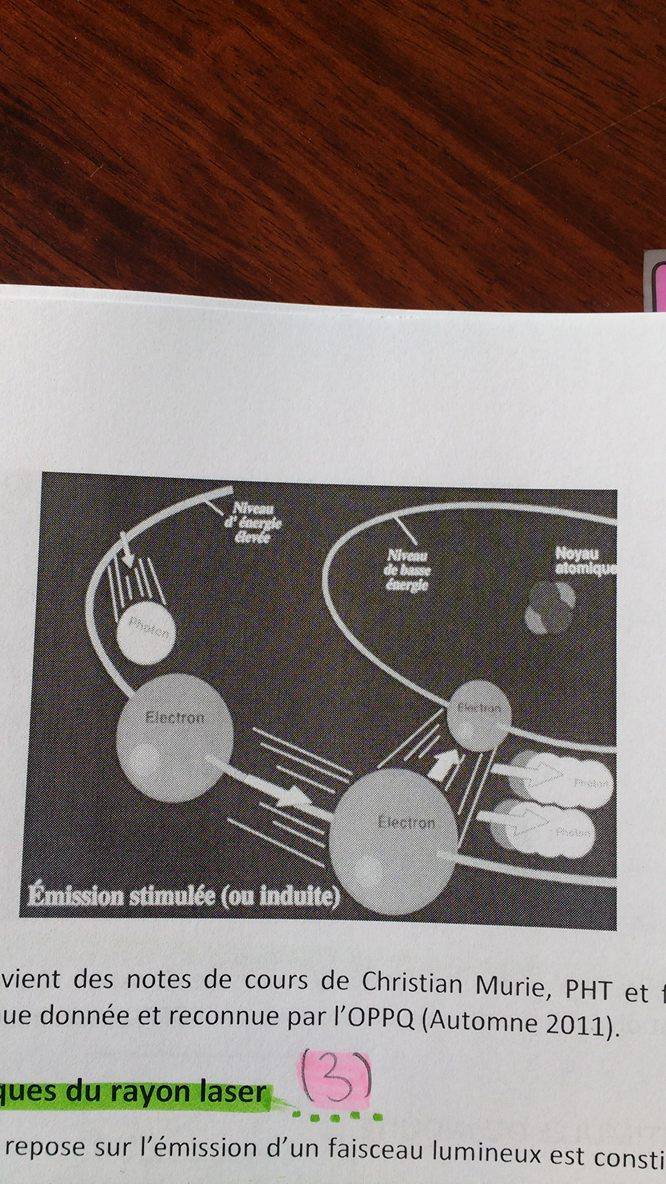 Il s’agit en fait de l’excitation d’atome à l’aide d’un courant électrique ce qui modifie temporairement le niveau énergétique de l’atome. Lorsque sont niveau d’énergie est plus élevé, l’électron change de palier( couche) ce qui libère un photon et permet de créer un rayon laser.