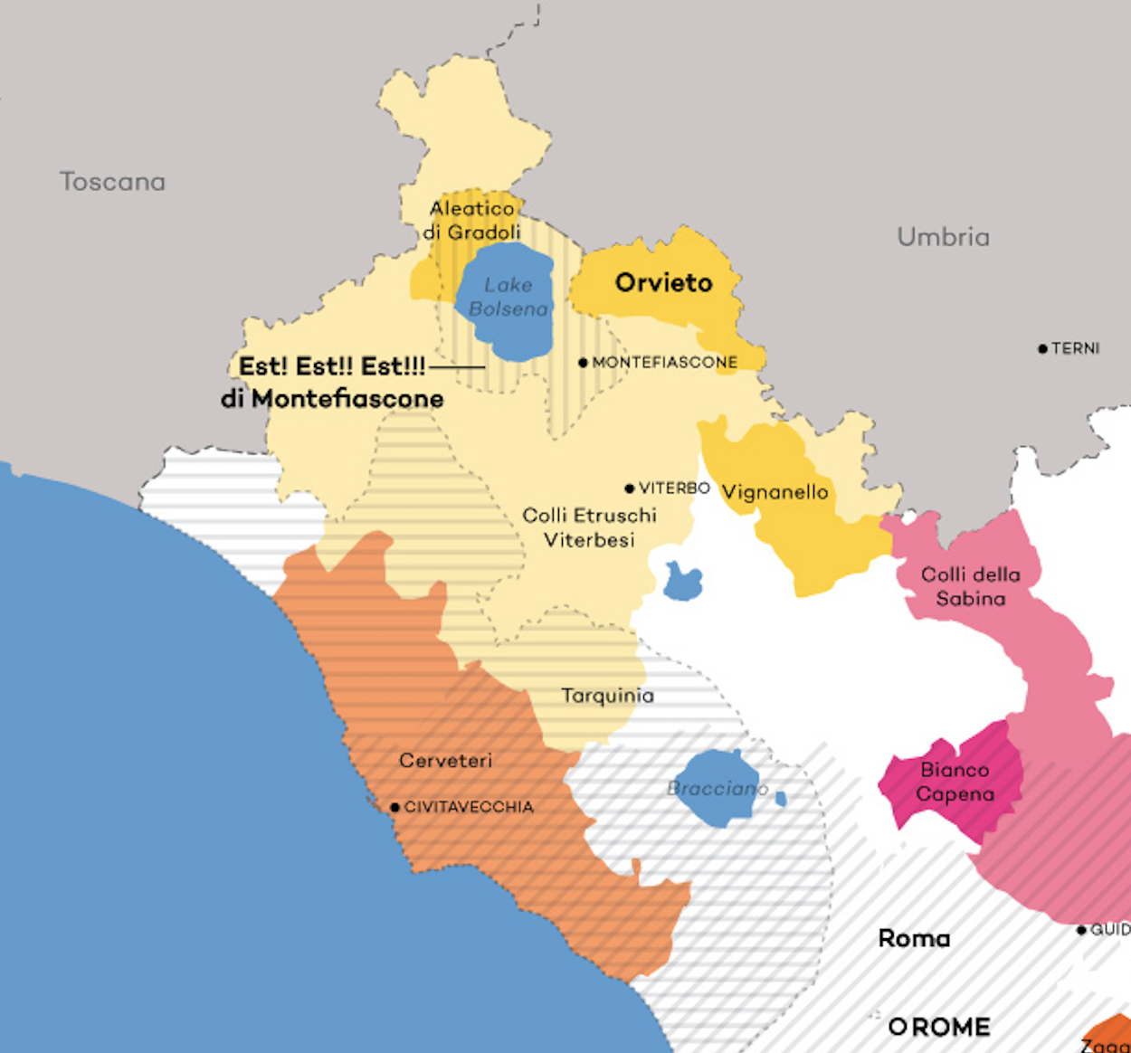 A medieval German bishop traveling to Rome sent an emissary in advance to scout out the taverns serving the best wine. He marked the doors of the qualifying establishments with the Latin word est, “it is,” and was purportedly so captivated with the wines of Montefiascone that he scrawled Est! Est!! Est!!! on its local inn