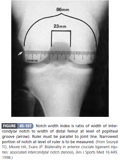 Intercôndilo estreito. Largura do intercôndilo/largura dos côndilos (medidos na altura do sulco do poplíteo): valor de referência 0,231+-0,044. Atletas com > 1 desvio padrão abaixo da média apresentam maior chance de rotura do LCA.
