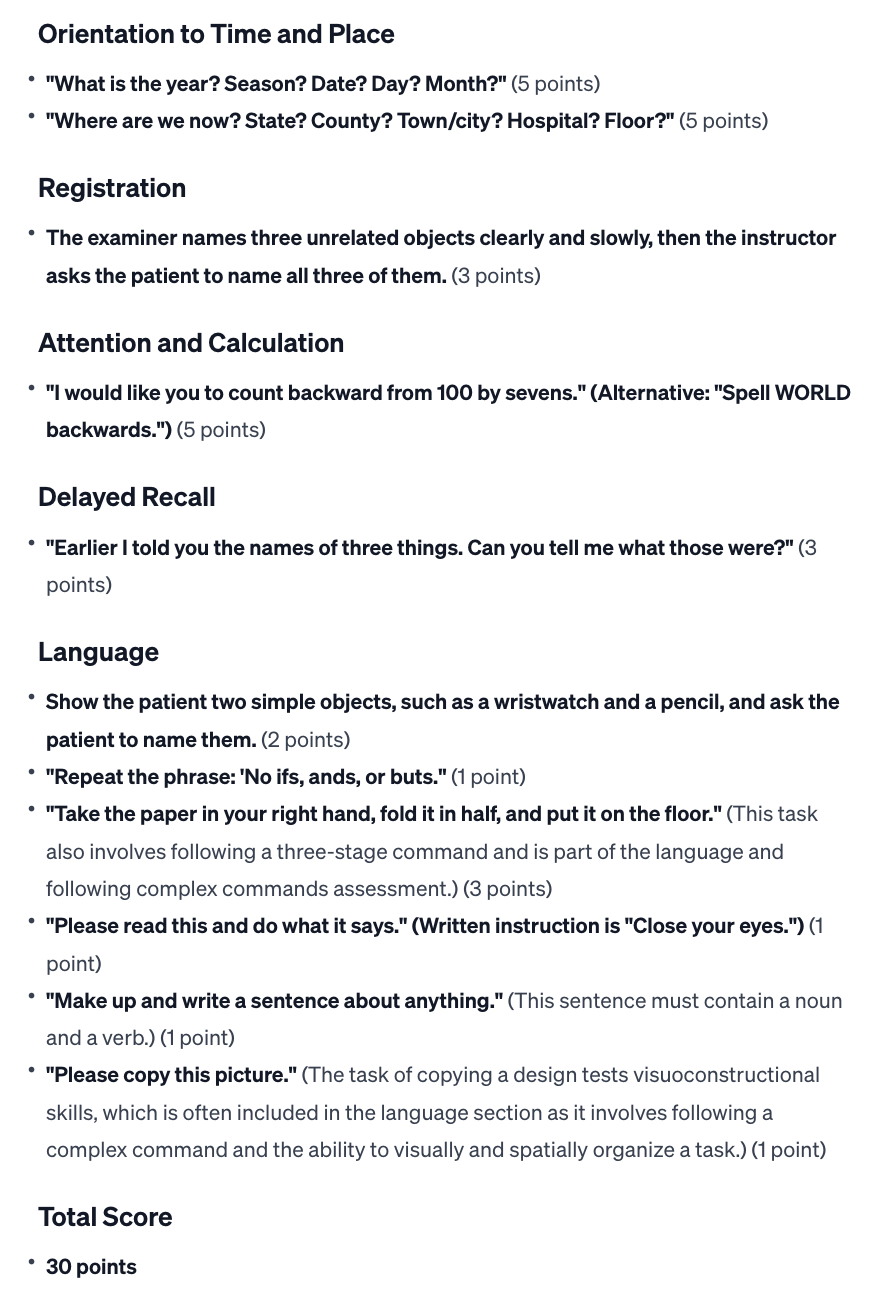 Rationalization: The Mini Mental Status Examination (MMSE) is a simple bedside test used to assess cognitive function and screen for cognitive impairment. It consists of a 30-point score that evaluates various cognitive domains, including orientation, recall, attention, calculation, language processing, and spatial skills.