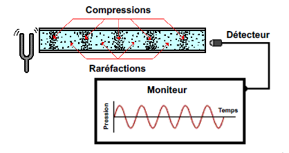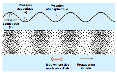 C’est le mouvement de va-et-vient d’un objet qui engendre des changements rapides de pression d’air (son) se propageant dans le milieu. Cela mène éventuellement à des sensations et perceptions auditives.