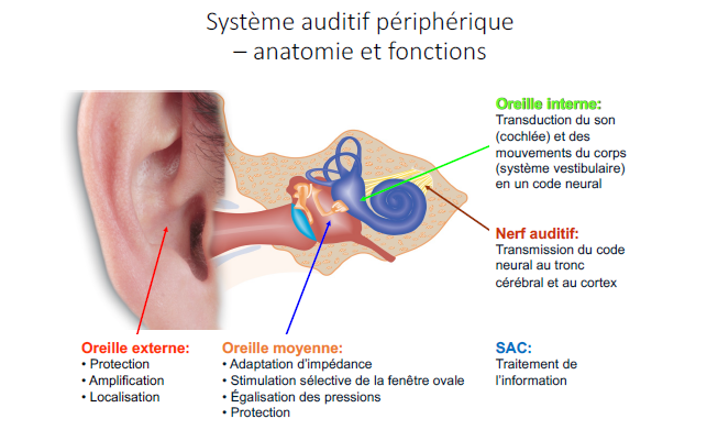 Transduction du son (cochlée) et des mouvements du corps (système vestibulaire) en un code neural.