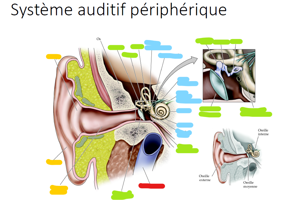 Nommez les cinq parties anatomiques qui contribuent à l’audition.