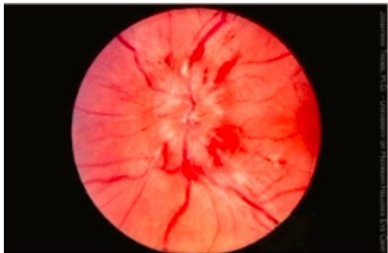Papilledema is swelling of the optic disc due to increased intracranial pressure. The clinical symptoms of headaches and blurred vision combined with fundoscopic findings of swollen optic disc would be most consistent with papilledema. The other options provided have distinct clinical and fundoscopic presentations different from the scenario described.