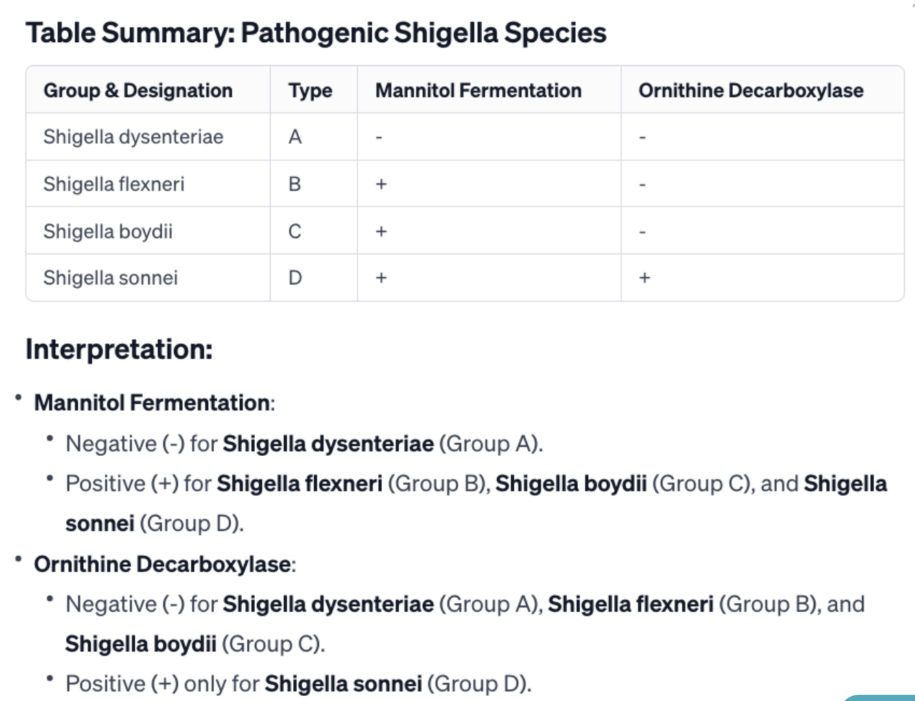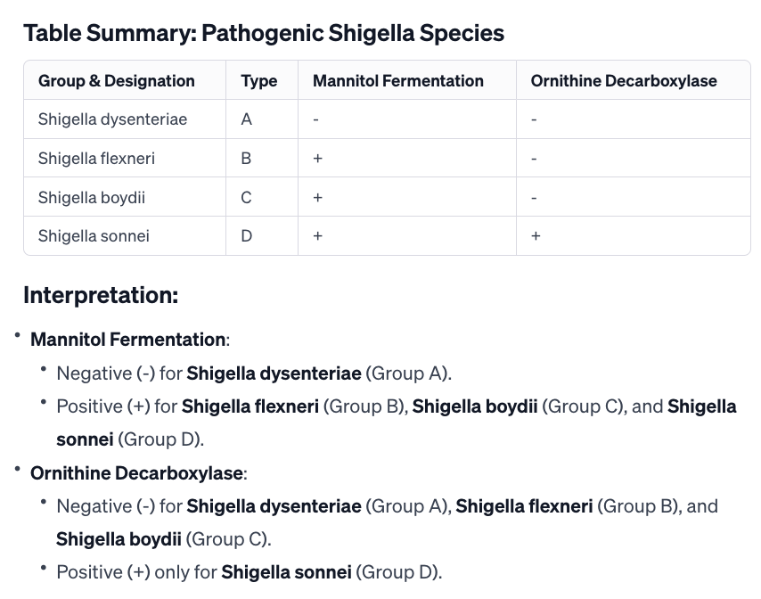 Does not ferment mannitol. This species is known for causing severe forms of dysentery.