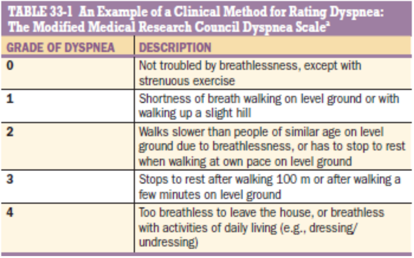 According to the Modified Medical Research Council (MMRC) Dyspnea Scale, a grade of 3 is assigned to patients who experience breathlessness after walking a short distance on level ground. In this case, the patient’s discomfort after walking 100 meters fits this description.