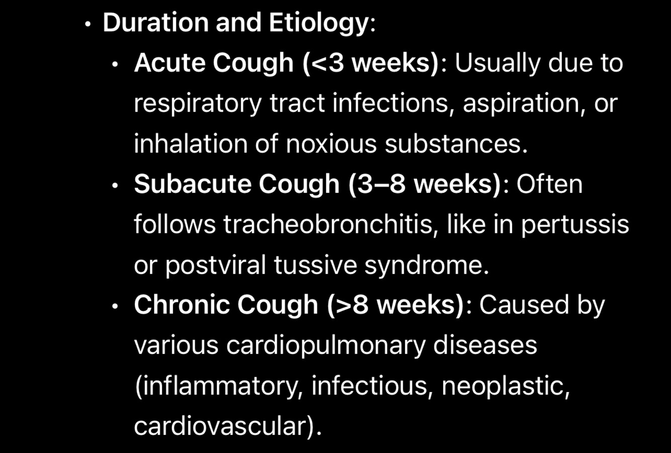 A cough that lasts between 3-8 weeks is often categorized as a subacute cough. This duration of cough is commonly seen as a residuum (or lingering effect) of tracheobronchitis, which is an inflammation of the trachea and bronchi, often following an upper respiratory tract infection.