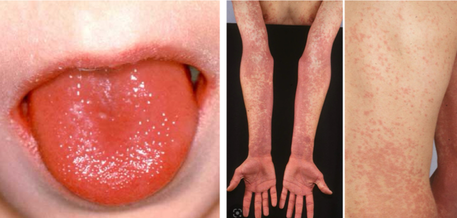 S/S: - sunburn-like rash, fever, strawberry tongue