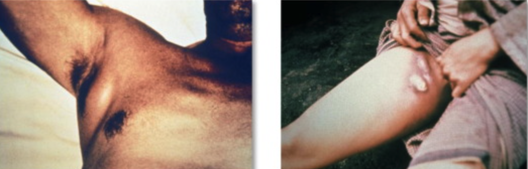 Bubonic plague: -S/S: buboes, high fever, sepsis, hemorrhaging